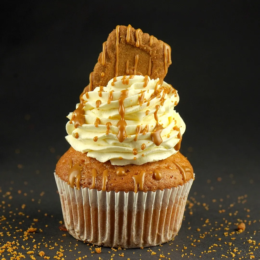 Our classic fluffy and moist vanilla cupcake filled with creamy Lotus Biscoff spread and topped with a delicious Lotus Biscoff flavored frosting and Biscoff cookie.